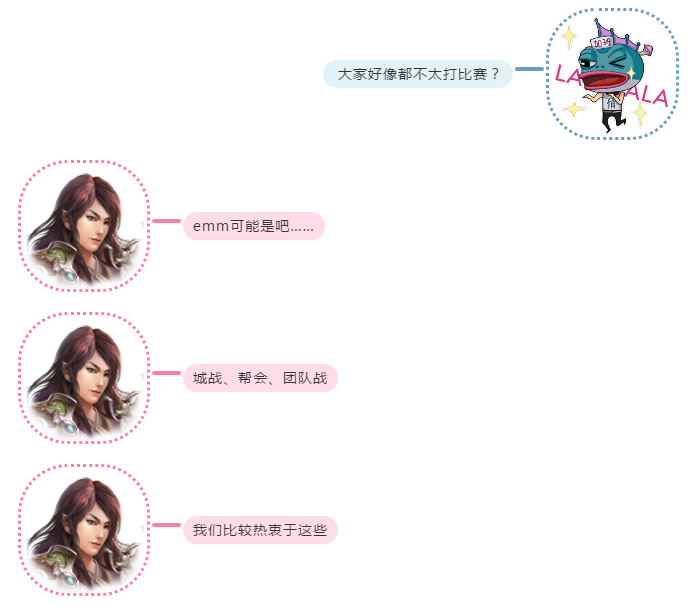 都怀抱着相同理念的他们能够走到一起,可谓是有缘千里来相会,因此比起比赛,他们更加期待未来什么时候会推出类似于城战、天门山这样的大型多人玩法。