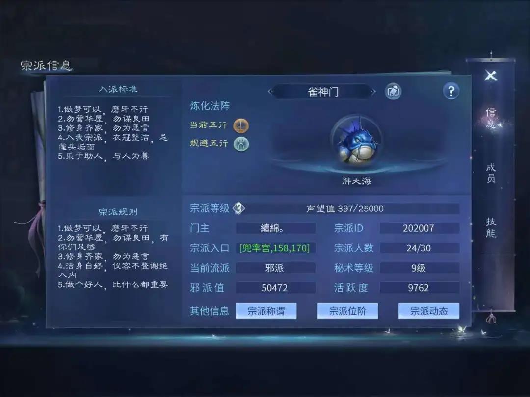 相信小伙伴们最为感兴趣的当然还是雀神门的现状啦!时隔才仅仅一周,一看,这门派算是邪定了,邪派值突破5W!