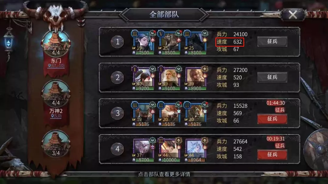 行军的速度是以队伍内的最低速来决定的,这意味着如果你的铺路队两个英雄700速,一个英雄400速,最终整只队伍的行军速度为400,而不是整只队伍的速度平均值。