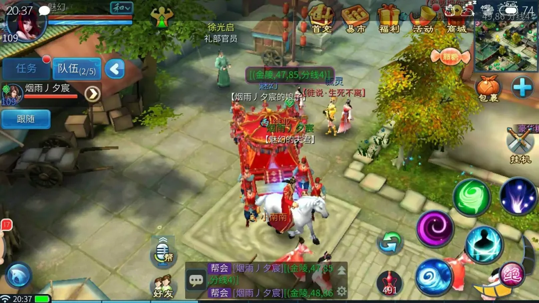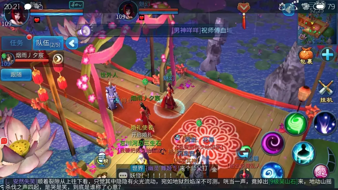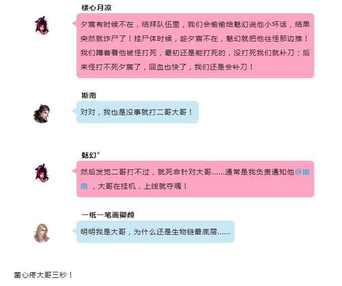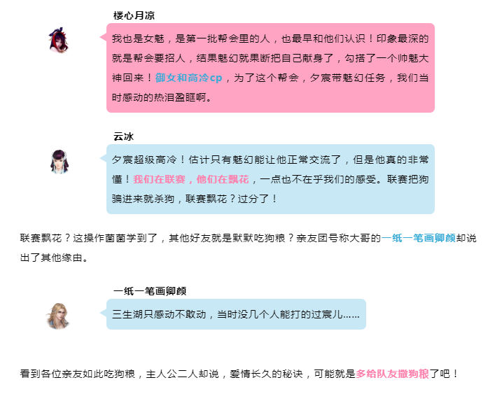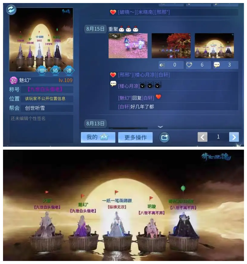 二位侠侣和他们的结拜的关系非常好!他们会固定一起组队清任务,聊天,切磋!婚前婚后,他们清任务的小队伍还是发生了一些变化。例如从前的带队小能手夕宸°光荣“退休”,变成了魅幻°。