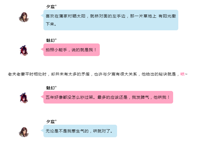 他们婚后每天都会一起组队去完成一条龙、守财、宝图等所有任务。在日常之外的日子,他们二人还是个风景党,喜欢在各个地图拍照,在蒲家村晒太阳,过着惬意的二人生活~