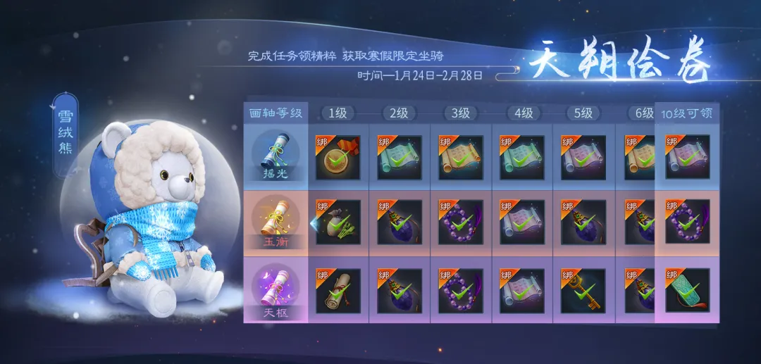 2. 收集一定数量的雪月精粹后可以升级绘卷等级,并解锁相应奖励,更有机会获得寒假限定坐骑。