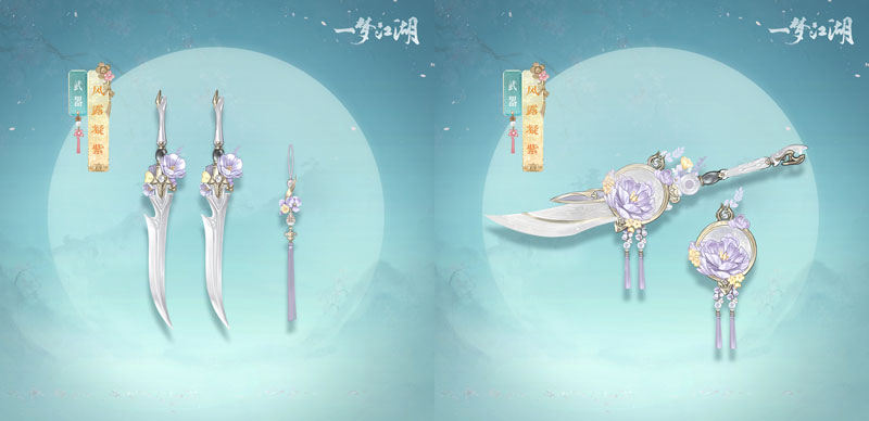暗香的主武器匕首承接着繁花装饰,以紫色花卉为最主要的装饰,辅以黄花点缀,白色与金色的珠玉晶莹剔透点缀其间,适度的留白雅观又别致。副武器使用三色花朵相互缠绕,珠玉制成水滴的形状,宛如破晓时分花瓣上滑落的露珠。