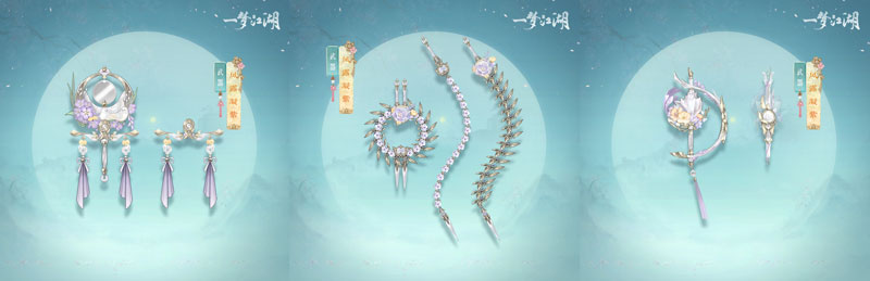 少林的禅杖通体透白,杖顶双环以繁花装饰,两边伸展出金枝绕成的小环,其上点缀着金羽叶,颇有自然之美。副武器杵色泽光洁,由纯净的白色花朵轻轻点缀,简洁中透着一丝出尘之味。