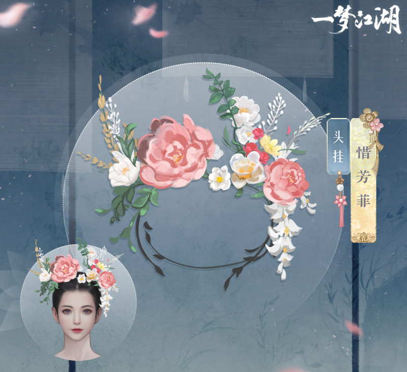春日百花盛开,正是插花的好时节,头挂·惜芳菲便是以百花编织而成的“插花主题”头挂。嫣然百花在芳草的点缀下,春光无限。众花竞放但又相映成趣,仿佛整个春天在发丝上绽放。