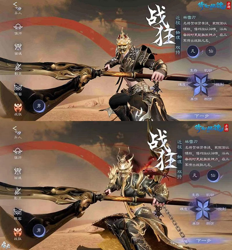 黄沙漫天,狂风呼啸,战狂林雪刃双手双刃出神入化,赤胆忠心尽显。射手萧若兰手持长弓,英姿飒爽;聂秋鹰身手灵活,雕弓一挽,箭无虚发,千里之外取敌之首级。甲士石云馨骁勇无畏,手抡方天画戟勇敌双刃战狂,尽显女将风范;霍击蒙身披金甲,冲锋陷阵,气宇轩昂,当真虎将!