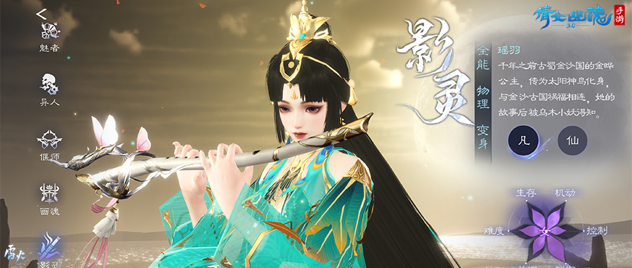 魅者冷月心白衣胜雪,挥袖抚琴激荡出弦音阵阵。风摇筝轻摇纨扇登场,魅人心魄;万妖宫中古木苍劲,天际泛着紫光的幽蓝,呈现出一派神秘莫测之景。火光从曼珠沙华掠过,异人花渐隐于这彼岸花间踽踽独行;叶葬花身着黑色长袍伫立于此,以血与恨浇灌着这片花海。