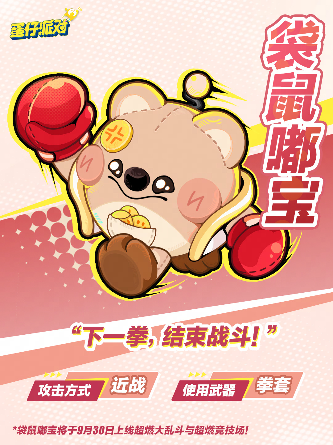 全新超燃蛋仔堂堂登场!国民原创乐园游戏《蛋仔派对》将于9月30日上线全新超燃蛋仔,“袋鼠嘟宝”和“刺猬绷绷”加入超燃竞技场和超燃大乱斗。战场激斗不断,新超燃蛋仔变身集结,带来全新竞技博弈体验!