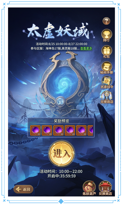 (1)冒险者们可通过主城【太虚妖域】进入活动,在妖域中探索,获得太虚灵砂并兑换丰厚奖励。