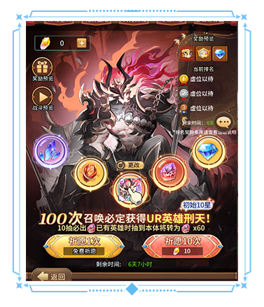 限时卡池【无终血焰】开启!活动期间,可自选UR英雄【应龙】/【蚩尤】/【西王母】/【刑天】作为心愿英雄,卡池中可以使用【天元玄晶】进行召唤,抽奖途中可任意更换心愿英雄,进行祈愿有概率抽到【心愿UR英雄本体】及【心愿UR英雄元晶】。
