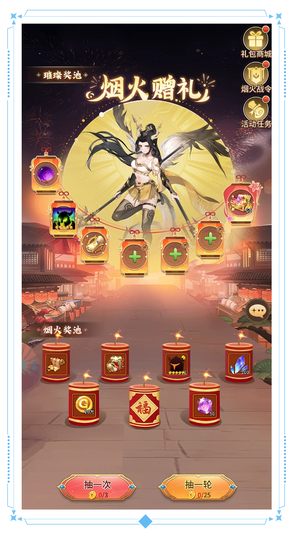 活动期间,冒险者可通过道具昆仑古钱进行烟火赠礼奖池抽取,活动分为【烟火奖池】和【璀璨奖池】两部分,当冒险者从【烟火奖池】中抽取到送福烟花后将会进入【璀璨奖池】并随机抽取其中一个道具奖励,超多惊喜豪礼等你来拿!