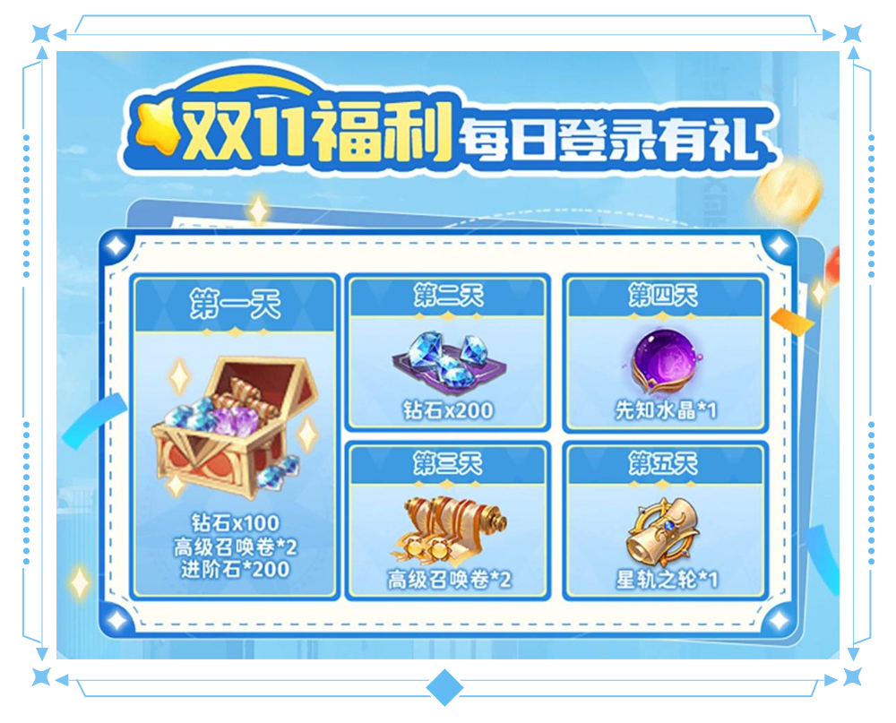 双11就玩闪烁之光,百万神券等你来瓜分!每日登录即可领取钻石、星轨之轮等豪华好礼!各类福利道具领不停,赶紧来参与吧!