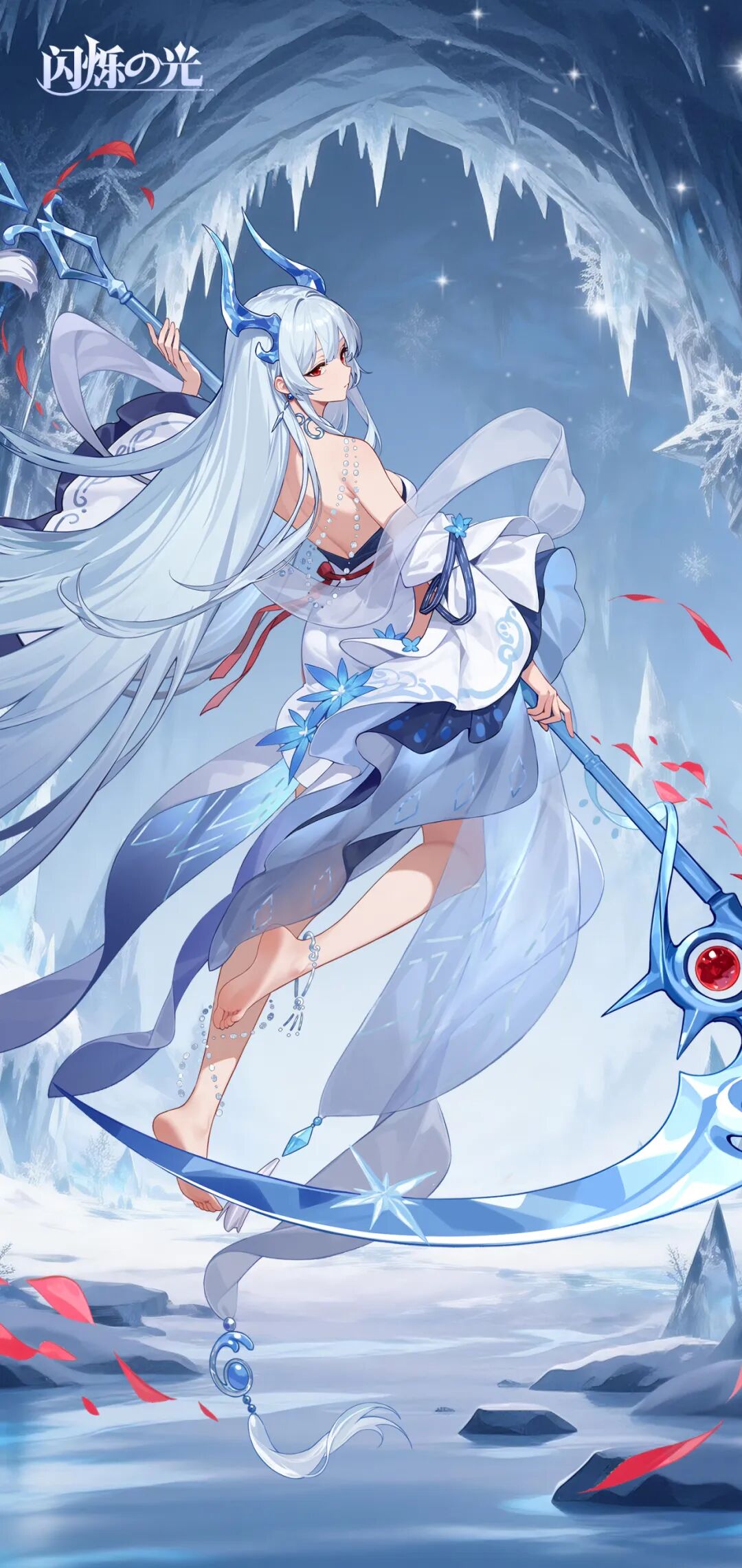 夜穹缀星覆霜华,冰蓝曳裙缠星纹,她持镰踏虚而立,衣袂与飘带随夜风漫卷,将寒空清辉揉进了清冷月光里。
