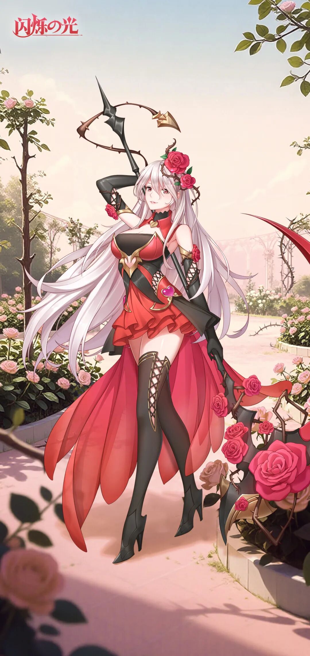 她立在花簇间,银发别着玫瑰缠荆棘织的冠,红黑裙裾随轻步微扬,风裹花香漫过肩头花饰,落进满园软香里。