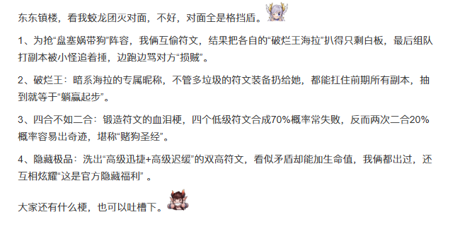 “盘塞娲带狗”阵容互偷符文,把“破烂王海拉”扒得只剩白板,最后被小怪追着捶的画面感直接拉满;“四合不如二合”的锻造血泪史,谁没为合成符文赌过运气?还有“高级迅捷+高级迟缓”的矛盾隐藏极品,也算一种另类的欧皇。