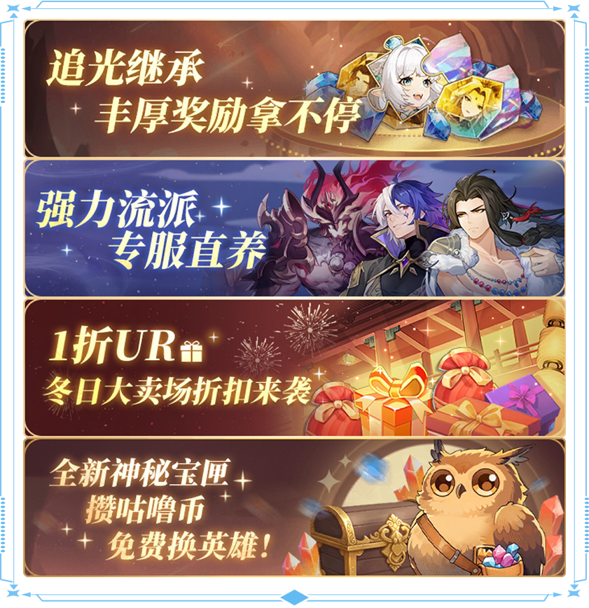 为了不浪费冒险者之前花费的心血以及能在新区更好的开荒,我们为专服设立了追光继承活动,还有预约专服即送一百连抽,强势阵容一步到位养成。在专服的主题大卖场活动中,还有机会能刷新到UR一折折扣!全新的钻石活动神秘宝匣,攒够咕噜币即可赢取丰厚奖励。相信每个专服都给到冒险者不同的回忆,不知道冒险者在专服里都发生过哪些趣事呢?