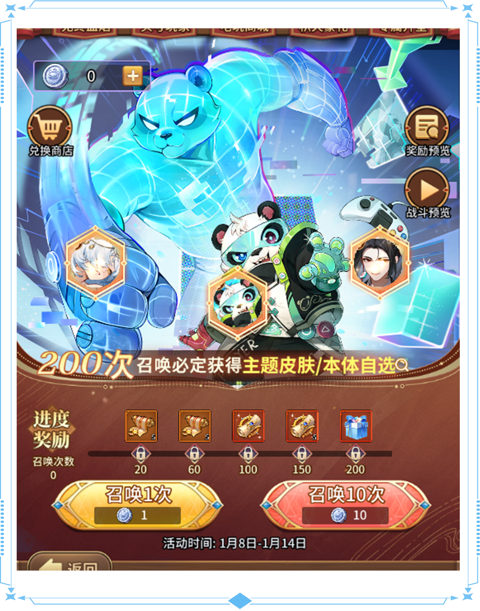 活动期间,使用【熊猫游戏币】参与头号玩家祈愿活动,即有机会获墨拳影刹皮肤【头号玩家】、墨拳影刹本体等稀有道具,活动中还可获取其他SP自然系英雄及皮肤哦!