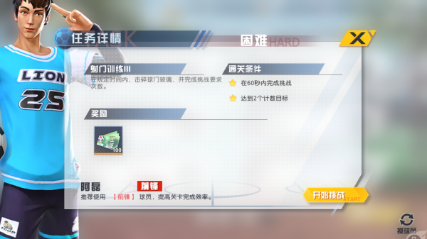 ②以上是射门训练III,难度等级属于困难,通关要求是要在60秒内完成射门挑战,进球的数目需要达到2个有效计数,通关奖励为生涯票券*100,生涯卡券可用于购买球员训练书。