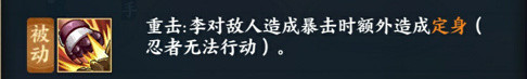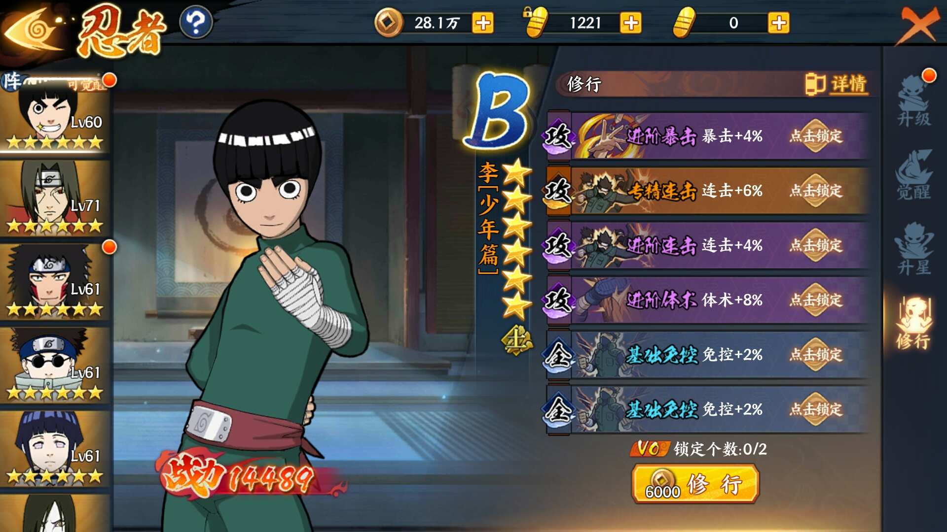 李[少年篇]毕竟是个爆发型忍者,所以推荐两种修行方式。第一种主要刷体术属性,这样一来能把李[少年篇]的伤害最大化,而且非常的稳定输出。第二种就是刷暴击属性,暴击可以配合李[少年篇]的被动造成定身,而且配合另一被动暴击率会更高,不过没有第一种的伤害稳定一点,毕竟就算暴击率再高,也有一定的运气成分在里面。