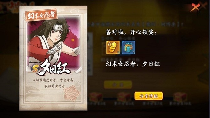 玩家可以通过每日答题以及分享获得食材,和服忍者碎片,以及礼花和爆竹等奖励。答题整体难度不高,不知道答案的话,可以看看好友们的分享。