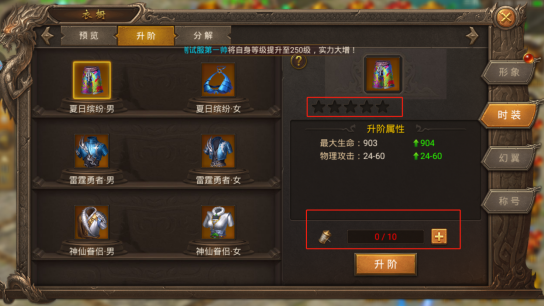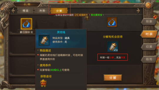 夏日缤纷(女)、神仙眷侣(男)、神仙眷侣(女)。其中只有雷霆勇者和夏日缤纷可以在商城中消耗钻石购买,神仙眷侣的时装目前不能直接在商城购买,时装升阶需要先分解多余的时装才能获得灵纹线,用灵纹线给时装升阶。同时需要注意时装分解无法恢复,需要谨慎操作。