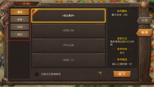 称号内又包含了角色、装备、历练、稀世这四种称号,称号又有3类分别是:1.永久类称号,指称号的有效期为永久有效,所有永久类称号获得的属性,均为永久获得。2.动态类称号,指当满足条件时,该称号有效,当不满足条件时,该称号消失。3.限时类称号,指当称号倒计时结束时,该称号消失、临时类或动态类称号,当称号消失时,所加成的属性也消失。