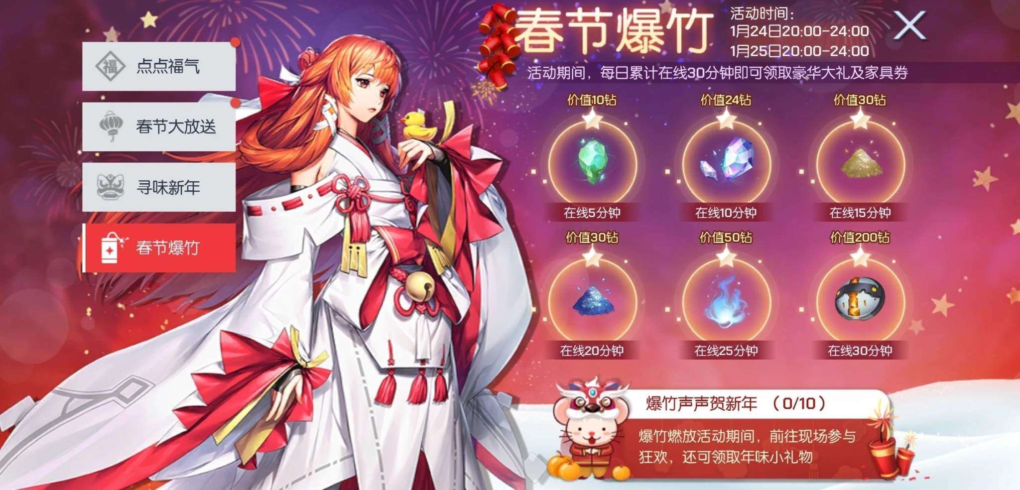 烟花鞭炮齐鸣,喜迎新春来临~在1月24日20:00—24:00和1月25日20:00—24:00期间,每日累计在线30分钟即可领取豪华大礼及家具卷哦~
