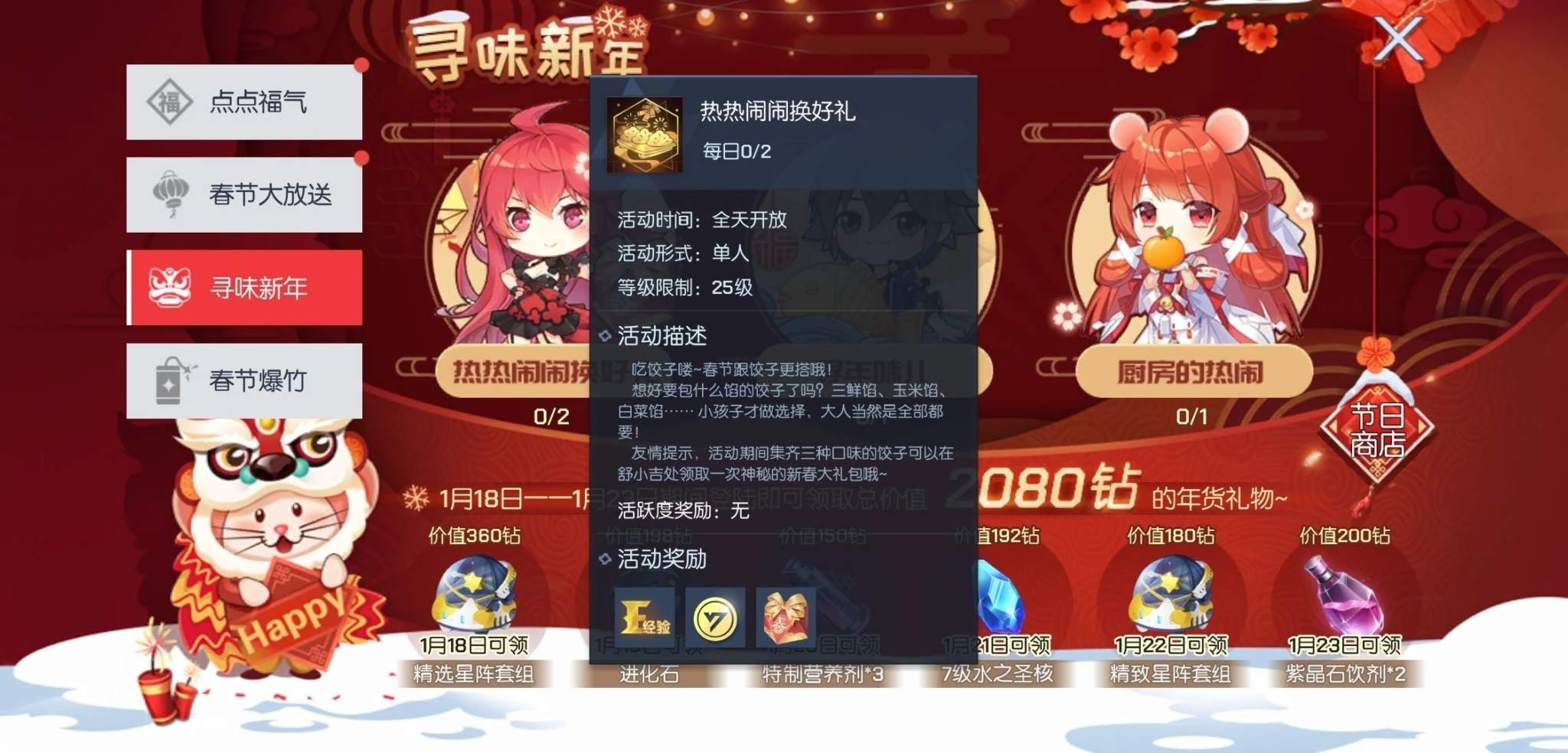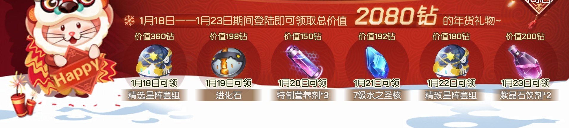 新春福利活动一阵阵,福利好礼领不停~在1月18日—1月23日期间登录即可领取总价值2080钻的年货礼物,免费的年货EVA也是头一次见,别错过啦~