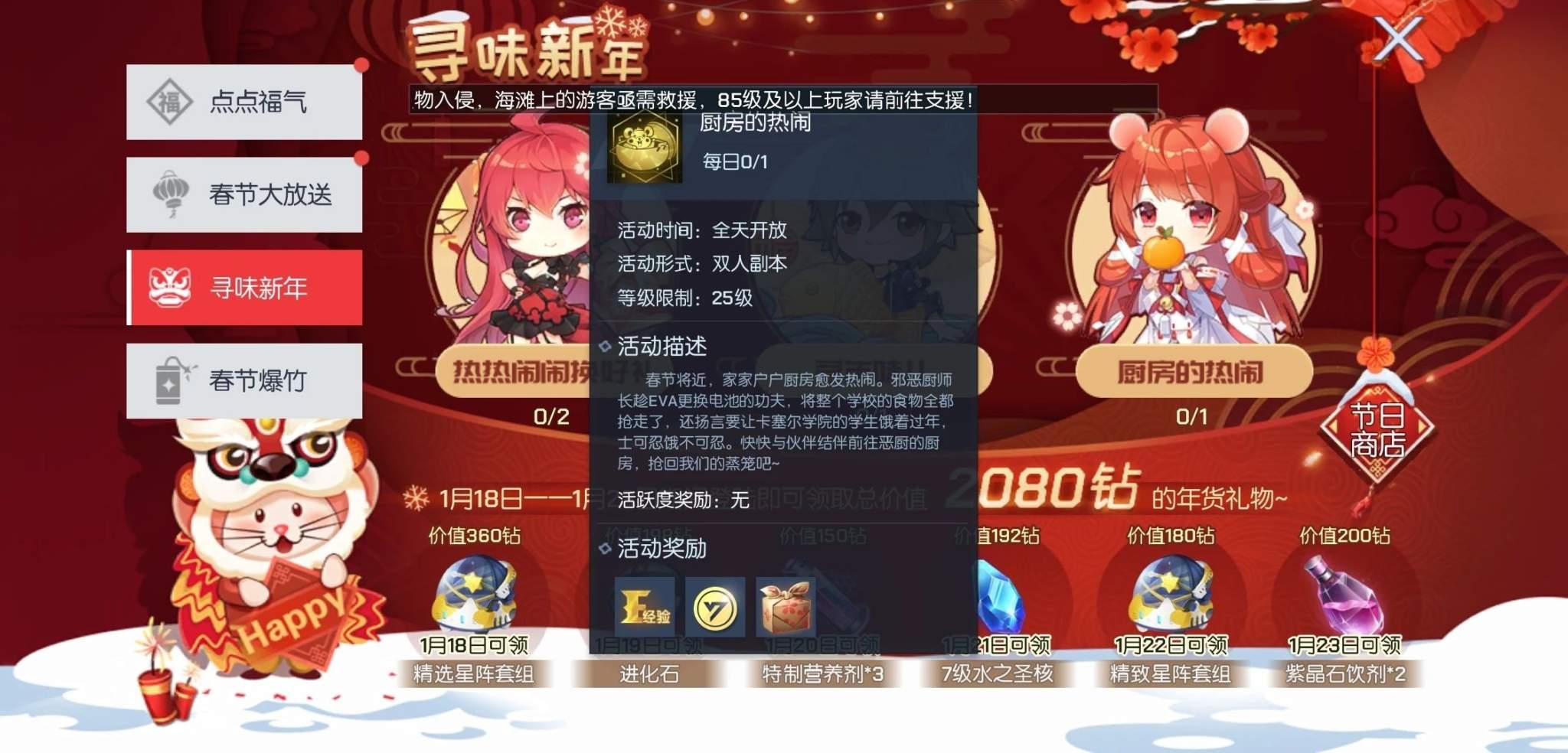 1月18日—2月12日【厨房的热闹】双人活动开启!同学们与同伴将化身为救世鼠,夺回食物!此等重任就交给各位同学啦,记得千万要小心,别被恶厨打到了哦。