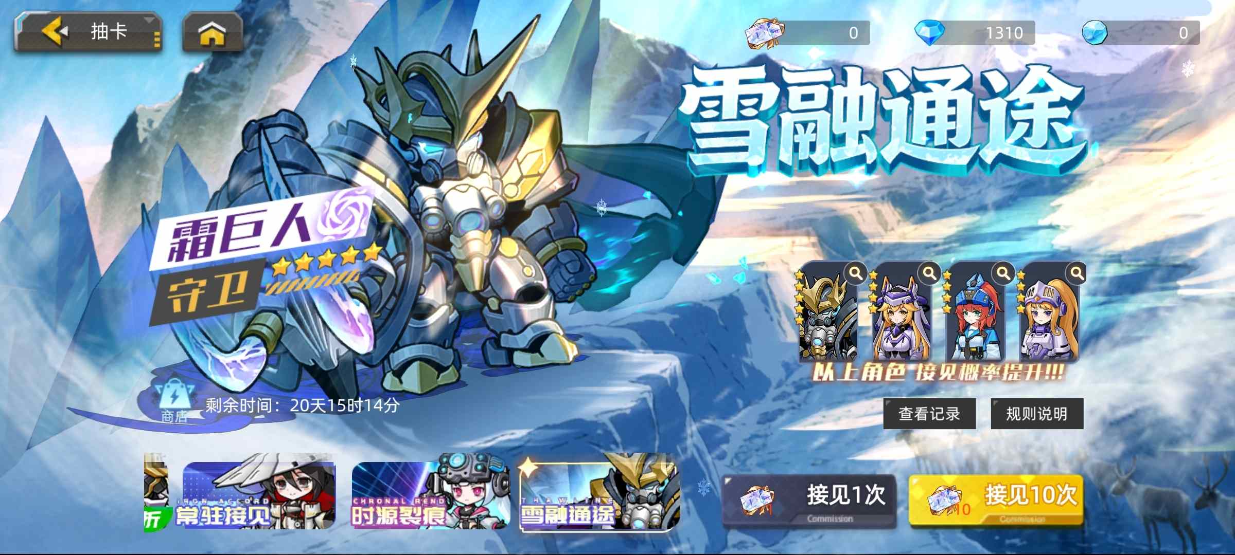 活动内容:活动期间,开启节日限定接见《雪融通途》,up机甲“霜巨人”抽中概率提升!