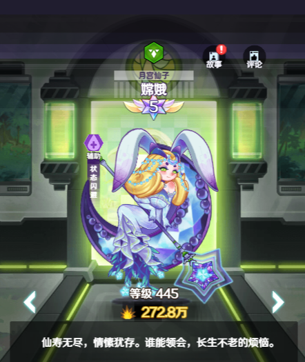所以嫦娥大部分时间都是在夜晚行动,当月光照射到嫦娥曼妙的身姿和纯情的脸庞时,男人无不为其疯狂。嫦娥最为瞩目的还是她身旁的那只白兔,平日里人畜无害的白兔看起来与嫦娥十分般配。每当嫦娥遭受危险时,白兔会利用月光的能量,变身为不可名状之物,原本性格温顺的兔子会化身为戏耍敌人的恶魔。