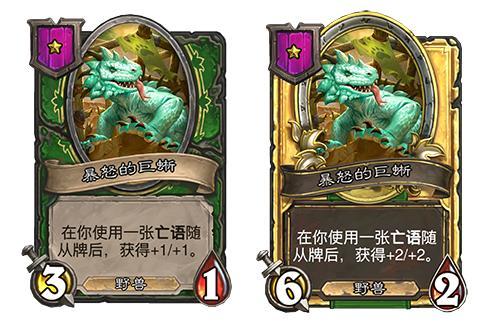 新随从: [等级1,野兽]3点攻击力,1点生命值。在你使用一张亡语随从牌后,获得+1/+1。