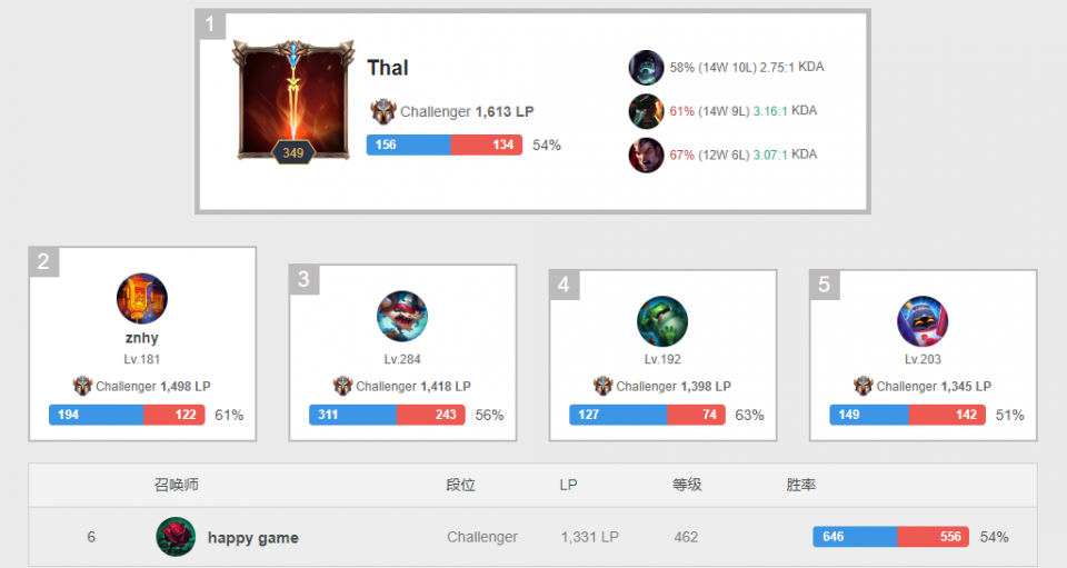 客观来说,琪琪Able确实是天才,这是LOL韩服Rank积分榜TOP6,位列榜首的是前T1上单Thal,紧随其后的是RNG队长小虎,后者也是LPL联赛名次最靠前的顶级中单,而走A怪大号“Happy Game”(快乐游戏)以1331超高胜率位列积分榜第六位,是整个LPL联赛数据最豪华的超一流ADC,年仅20岁的他值得高看。