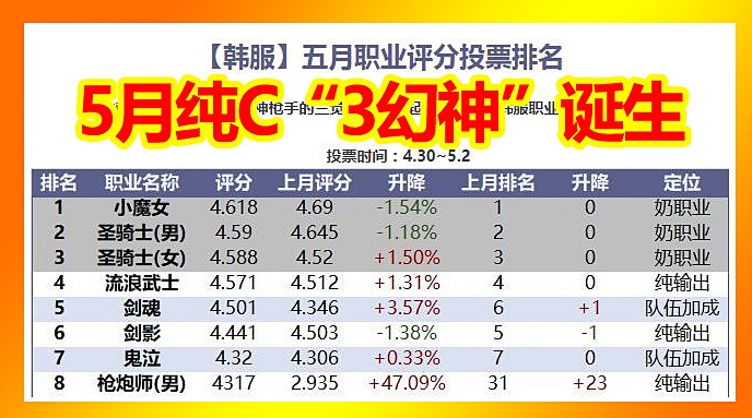1、剑豪,这个在韩服和国服都是一致的,输出和数据都非常的高,韩服投票还是比较契合国服的 不过散打女讲道理 除了柔化操作难 伤害还是可以的。 精灵这个职业 真的很奇葩。设计之初的唯一优点就是破甲 没了破甲果然六一了。
