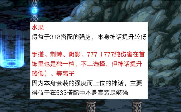 其中,手搓、荆棘、阴影、777和等离子,这几个神话装备因套装较强,从而排在了T2的位置。而且,搭配“5+3+3”的模式时,也是相当的不错。