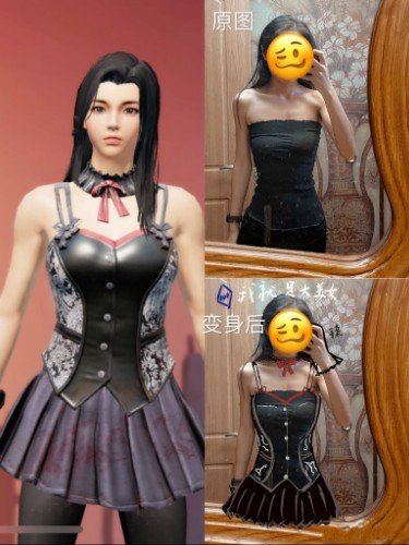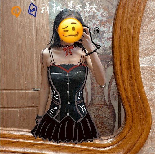 如图所示,由于“黑夜传说”这套衣服在现实里并没有出现,所以这位女玩家找到一套比较接近的黑色衣服,然后通过“鬼斧神工”的绘画技巧将衣服的细节甚至黑色的百褶裙都画在了自己的照片里。
