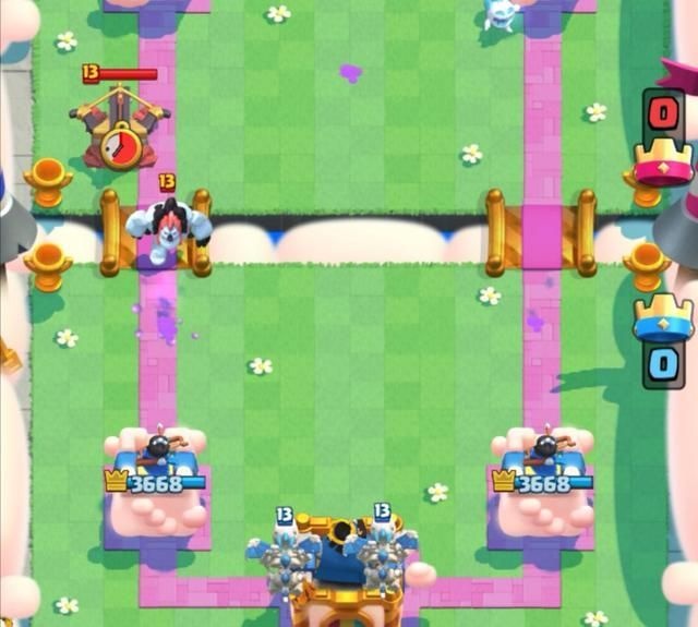 对方解掉刺客后必然要反打,玩家可以分路沉底骷髅龙,并用冰人和亡灵进行防守,解掉后可以分路沉底火枪手,待其走到桥边时分路野猪,同时向两路发动进攻。