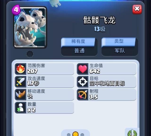 皇室官方推出的第二张空中aoe单位现已可以使用,这张卡继承了飞龙宝宝的机制,费用相同并可以在空中对敌方进行范围伤害,虽然血量还不到飞龙的一半,但却拥有两只,总伤害是飞龙的两倍还多。