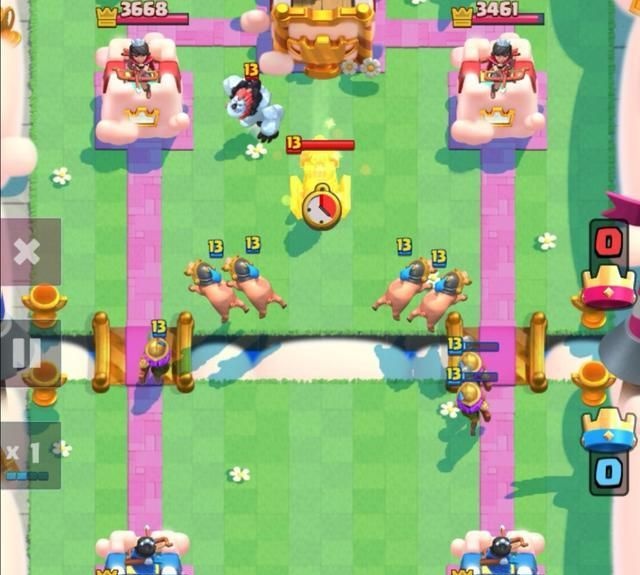 到了双倍圣水时期,玩家可以通过用治疗精灵、冰人、滚筒来快速过牌,多次释放皇猪,然后趁着对方应接不暇的时机沉底三枪、骷髅龙,组织一波大推进。