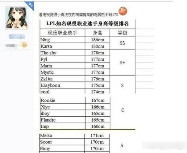 电竞圈备受关注的情况下,电竞圈有了很多大家喜欢的选手,而选手们也拥有了庞大的粉丝量,选手们在镜头前的样子一直是个迷,最近有网友将选手们的身高大概统计了一下,发现在LPL选手中,各个选手的身高差距非常大,而且有时候在镜头前看他像一个大哥哥,实际上却并不怎么高大。