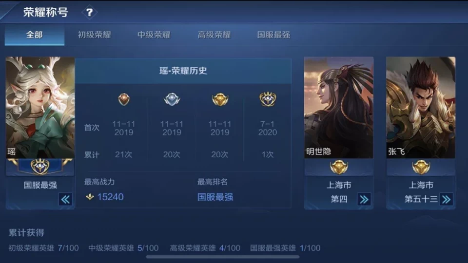 当然,这些都不是大家所关心的,现在大家最想看到的是这个玩家的瑶战力,以及他的排名。在点开这个玩家的瑶主页后,可以看到这个玩家现在瑶战力是15240点,可以说是非常恐怖的。虽然说15240点战力放在其他热门英雄榜单中,也就是一个普通国服的位置,但是我们要知道,这是瑶,而不是其他热门英雄。
