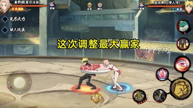 原来泳装小樱的奥义在最后一段的时候并不是击飞效果,也就是说如果对方处于站立状态,在奥义结束后只会有一小段的僵直,现在的泳装小樱奥义最后一段会直接击飞,再加上类似钢子铁一样的可自由移动的奥义效果以及轻松接技能,泳装小樱现在也可以直接无脑反手开大了。所以,对比百豪纲手以及其他忍者的优化和加强,我倒觉得这次的最大赢家是泳装小樱,虽然可能在整体强度上仍然属于娱乐忍者,但原来糟糕的普攻稳定性以及技能的细节都不太到位,这次的优化可以称得上是大加强。