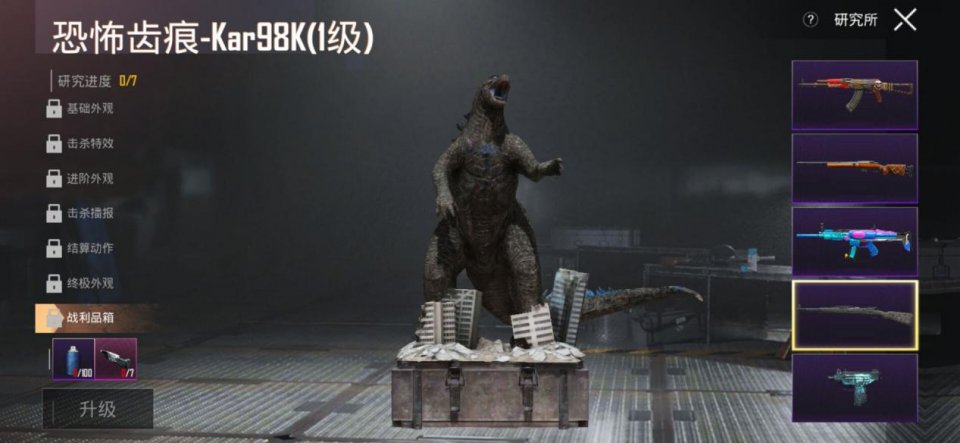 这款98K皮肤有邪典气息,枪身充满抓痕和齿痕,但是击杀特效却帅到爆炸,整整一只哥斯拉怪兽,下面还有大楼的模型,这款特效应该给哥斯拉剧组掏版权费了应该,这款击杀盒子堪称本期盘点中最亮眼的一款。