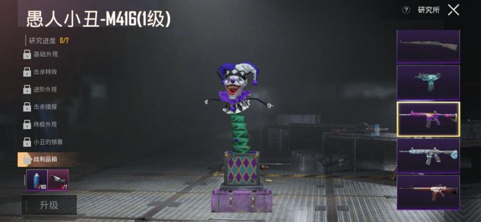 Joker M416皮肤的击杀盒子,这是一个动态特效,敌人死亡后的魔术盒子会弹出一个小丑头像,冷不丁真的可以吓人一跳。这个特效最好的地方就是击杀之后不怕找不到盒子,显眼的小丑脑袋丢在任何地方都能看到。