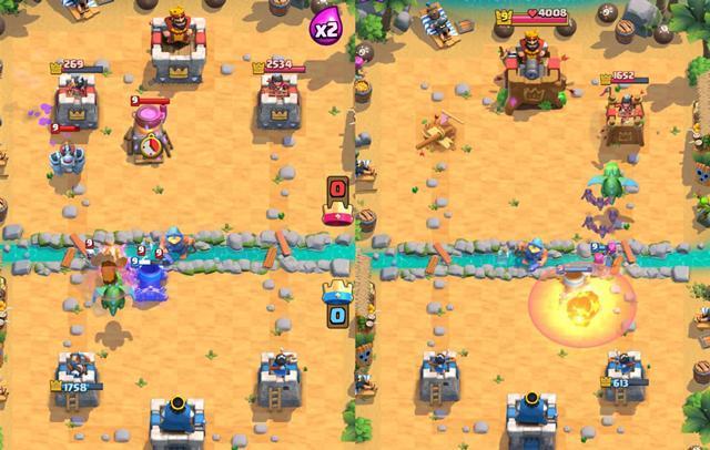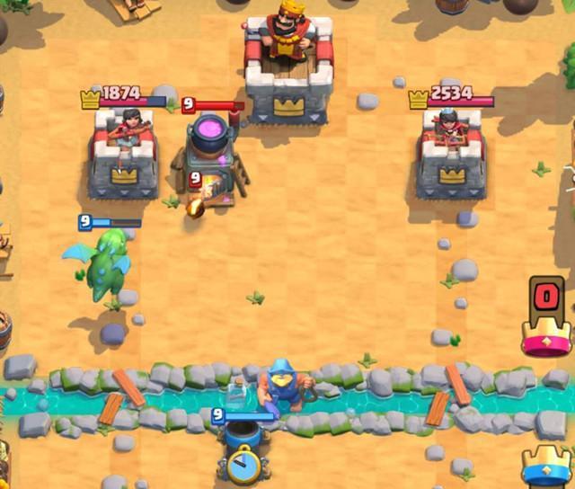 在为数不多的几场实战中,对手确实和晓东料到的一样,大多数用的都是天狗和气球兵的组合,而且其它卡牌也是空中单位居多。所以晓东的开局就直接架炮去打防御塔了,如果对手拿不出地面卡牌,那么迫击炮最少能打他防御塔一下,带上他中置的空中防守,这3点费用已经很值了。