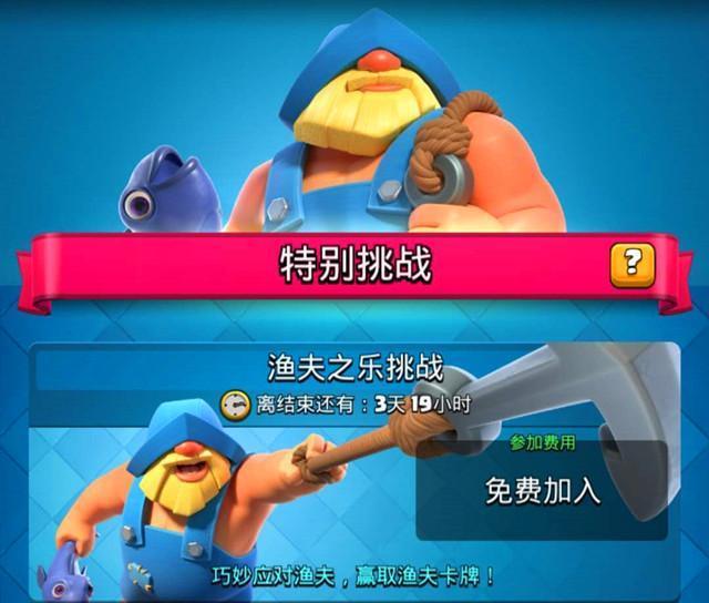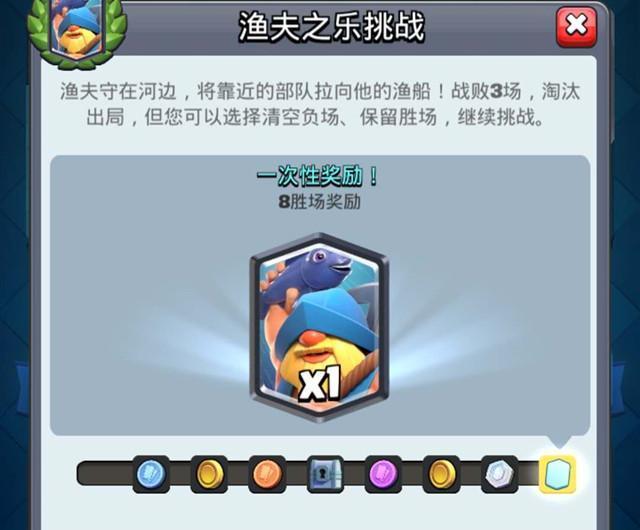 奖励不算太丰富,只有5000的金币和一个宝箱,还有4枚各品质的换卡币,终极奖励则是一张渔夫卡。规则依旧是9级卡等,淘汰3场出局,但可以花50宝石重新进入。只是在这个活动中,渔夫并不是从国王塔后面出来,而是站在河道中间对双方玩家的卡牌进行无差别拉人。