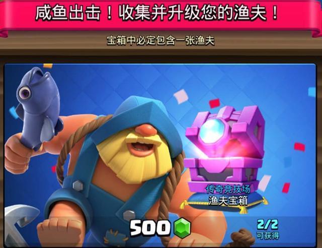最后,CR还在这个挑战赛上线的同时,加入了一款“咸鱼出击”的礼包,500宝石就能拿到最少一张渔夫,等于是个“定向传奇宝箱”了,在目前渔夫大火的情况下,这个礼包应该会有不少玩家入手吧。