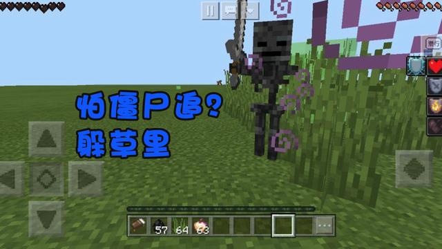 如果被僵尸追赶怎么办,逃是逃不掉了。我们只要躲到草里面,蹲下,因为僵尸看到草就以为是方块,是一个很好的隐蔽作用。除了凋零骷髅,因为它比高草丛还高!