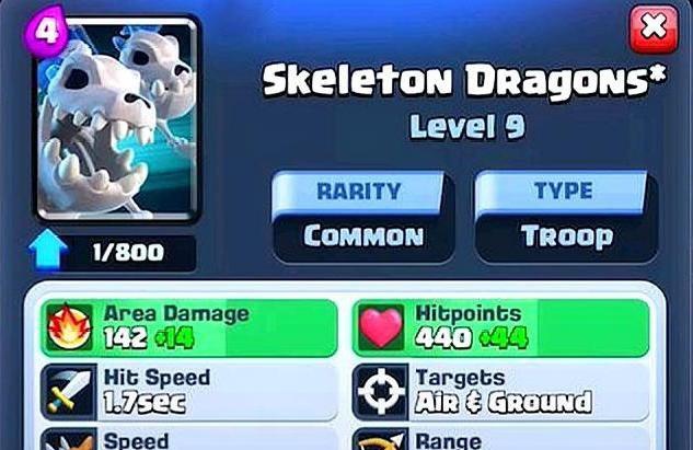 不过喷火的事情先放一放,咱们先简单来了解下它的属性。骨龙为4费普通卡,生命值做到了标准化的440点,攻击速度1.7秒,射程3.5格,范围伤害为142点,并且每次能出现两只,所以伤害也理所当然的要翻倍了。