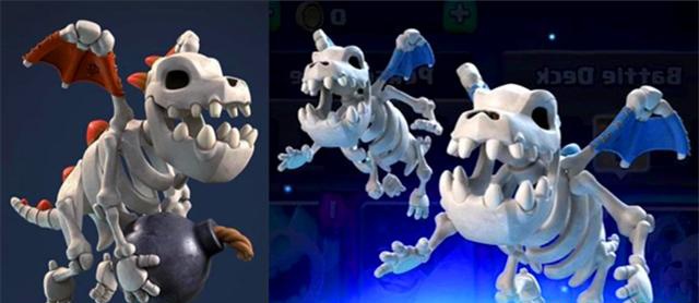 这么看的话,这张新卡牌在某些地方还是挺像飞龙宝宝的,比如它们都可以喷射火球,打出的攻击一样也是范围伤害。但在生命值方面,飞龙宝宝要比它们更肉,只是伤害方面的差距就相当大了,毕竟骨龙原本的伤害就要比飞龙宝宝高,而且它们还是两只一起行动。